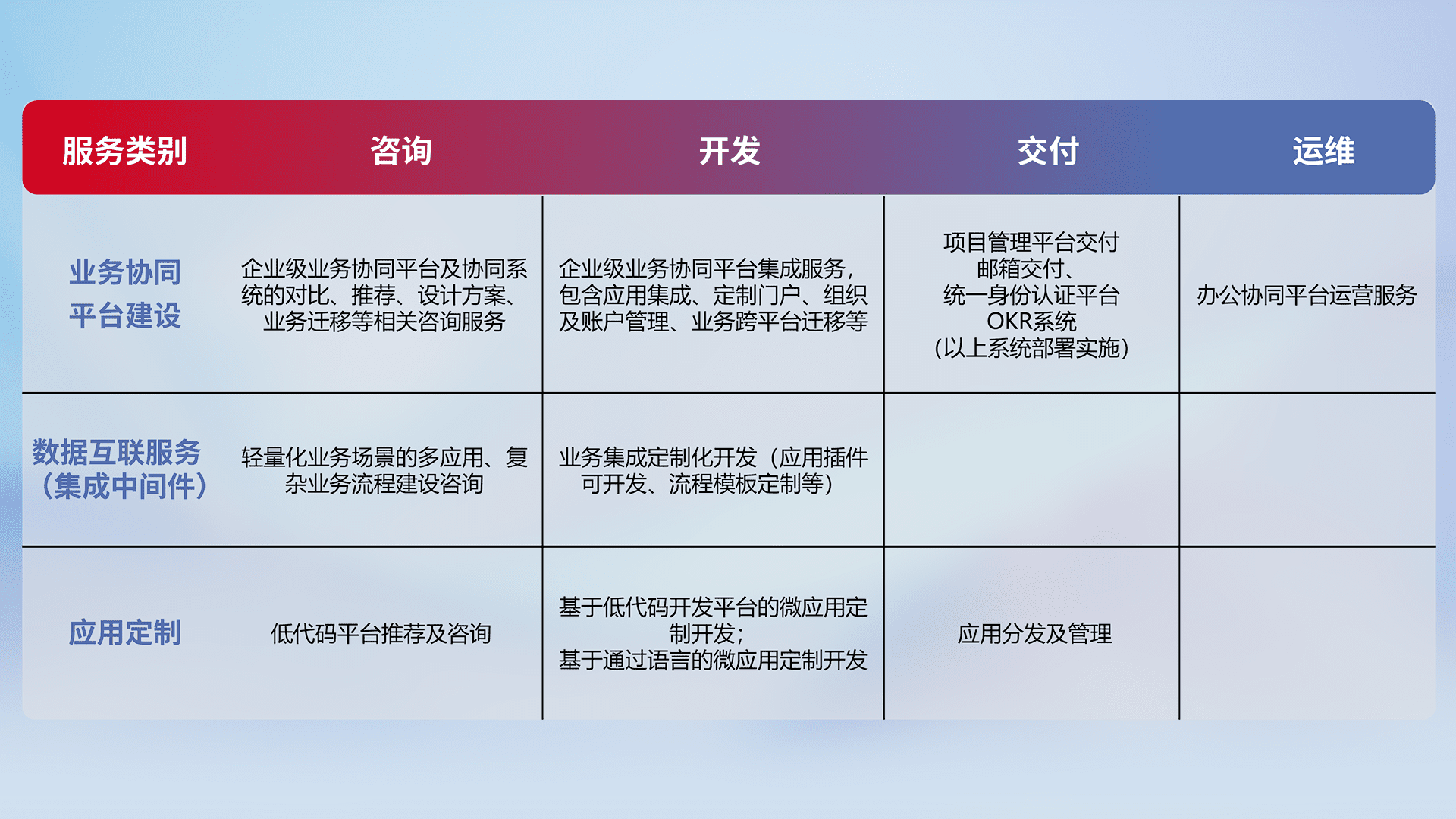 针对钉钉、、、、企微、、IDaas等平台级产品提供产品的规划、、、、方案、、交付、、、定制化开发等服务,,实现如统一协同办公、、、智能客户服务、、、、混合会议管理、、智能数据查询、、、、等业务场景,,,,实现数字化转型。。